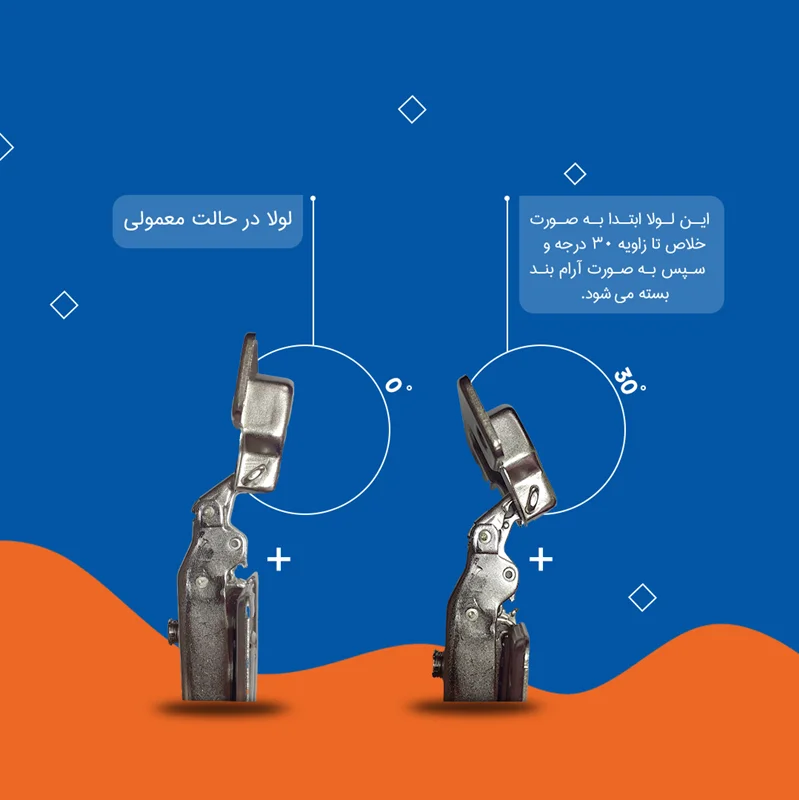 این لولا ابتدا به صورت خلاص تا زاویه 30 درجه و سپس به صورت آرام بند بسته میشود.