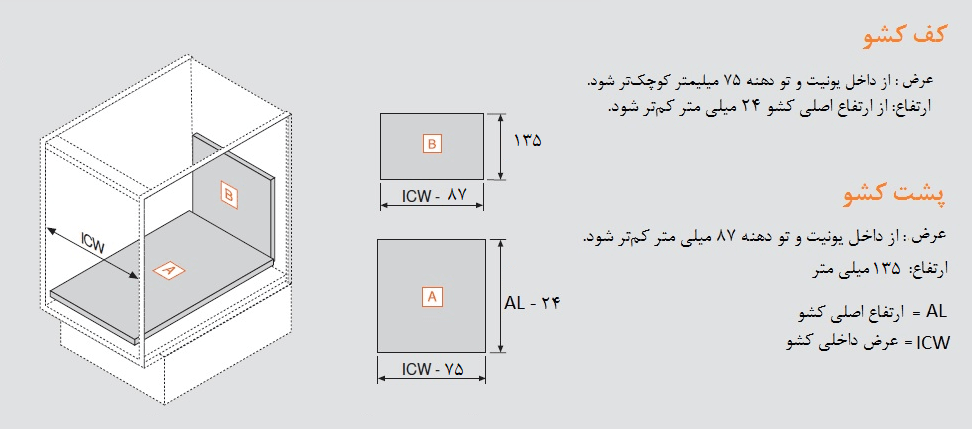 - عرض کف کشو از داخل یونیت و تو دهنه 75 میلیمتر کوچک می شود.